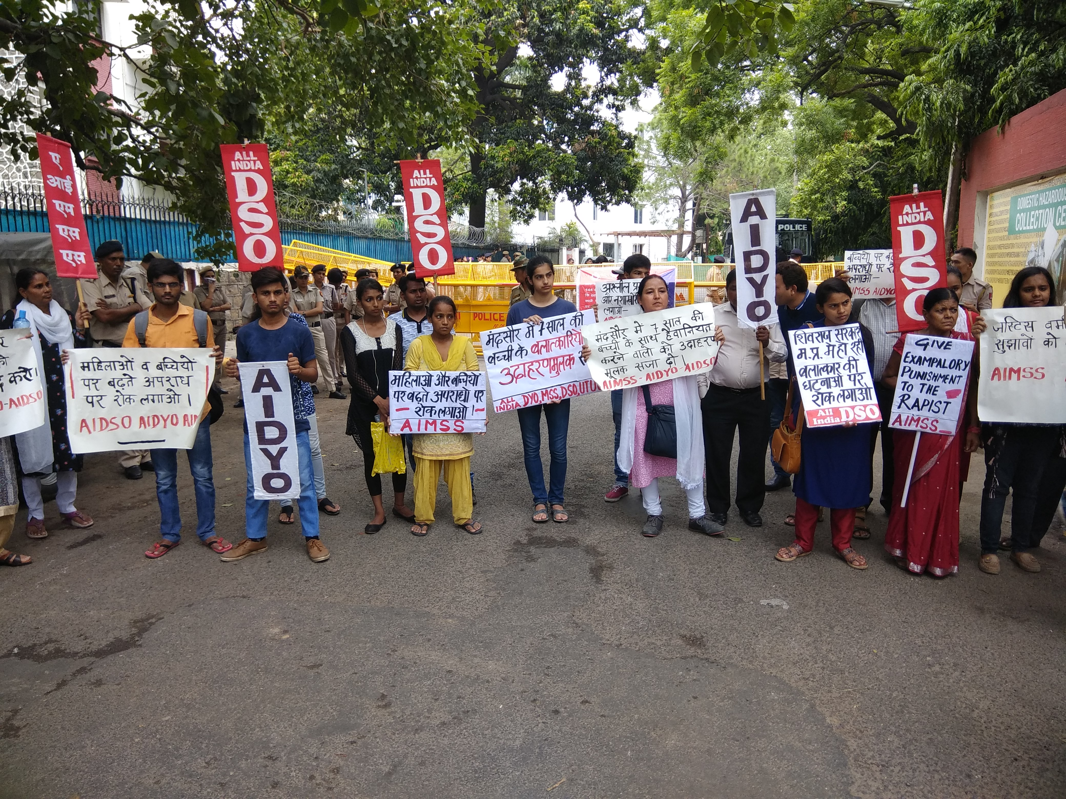नई दिल्ली: मंदसौर जिले में 7 साल की मासूम बच्ची के साथ हुए सामूहिक बलात्कार की घटना पर देेश भर मेंं जबरदस्त गुस्सा है. मध्य प्रदेश की इस घिनौनी घटना के खिलाफ शनिवार 30 जून को एआईएमएसएस, एआईडीएसओ और एआईडीवाईओ की दिल्ली राज्य कमेटियों ने यहाँ मध्यप्रदेश भवन पर एक विरोध् प्रदर्शन किया जिसमें दिल्ली के तमाम  इलाकों से आए छात्राओं, नौजवान और महिलाओं ने हिस्सा लिया।