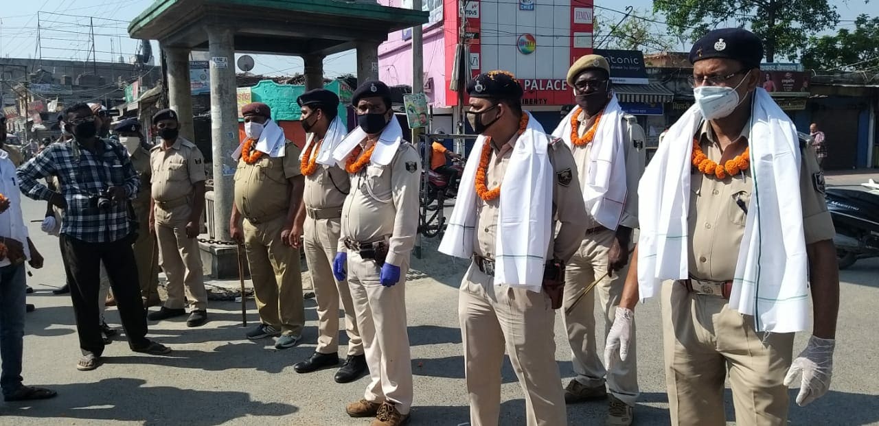 वैश्विक महामारी कोरोना से लड़ाई में पुलिसकर्मी बड़ी भूमिका निभा रहे हैं। वे अपनी जान की परवाह किए बिना आम जनता की सुरक्षा सुनिश्चित कर रहे हैं। ऐसे ही पुलिस वालों को सामाजिक संस्था ग्रीन एंड क्लीन ने फूलों की माला पहनाई, अंगवस्त्र दिया और पुष्पवर्षा कर सम्मानित किया। साथ ही हैंड सेनेटाइज कराया और मास्क भी बांटे।